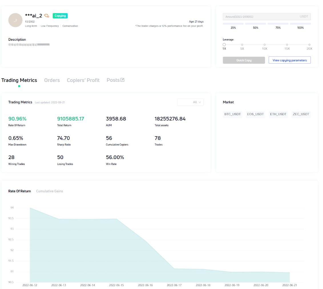 Profit-sharing ratio: the user copies the trader, the profit-sharing ratio is set by the trader and cannot be modified by the user.