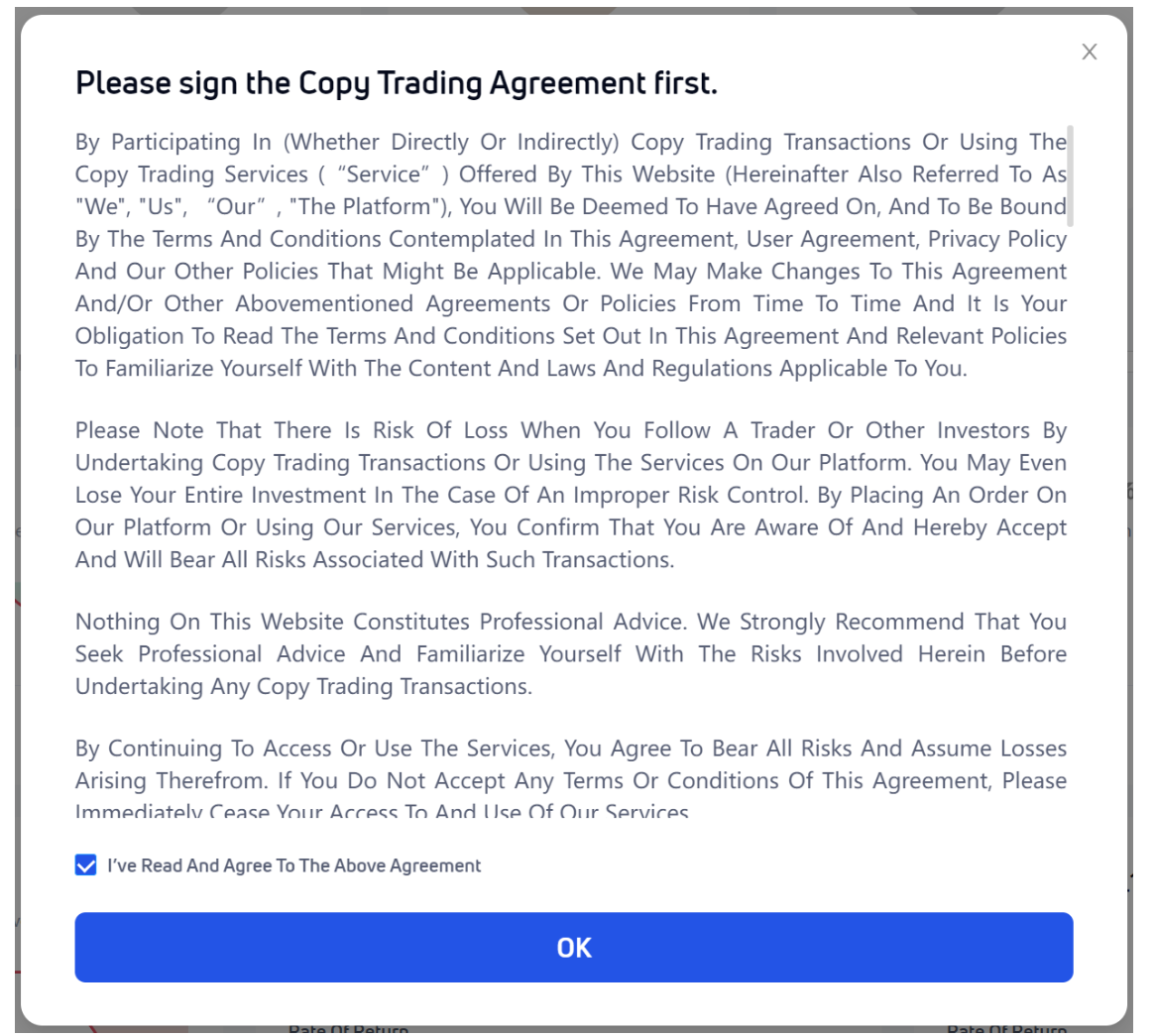 <8> The copy trading functions provided by the platform are for your reference only. If you make an investment decision based on the information provided on our website or through the information obtained through copy trading, you should be aware of the relevant risks in advance and bear all related losses yourself. We recommend that you seek professional advice before entering into any tradings in copy trading to reasonably estimate the risks.