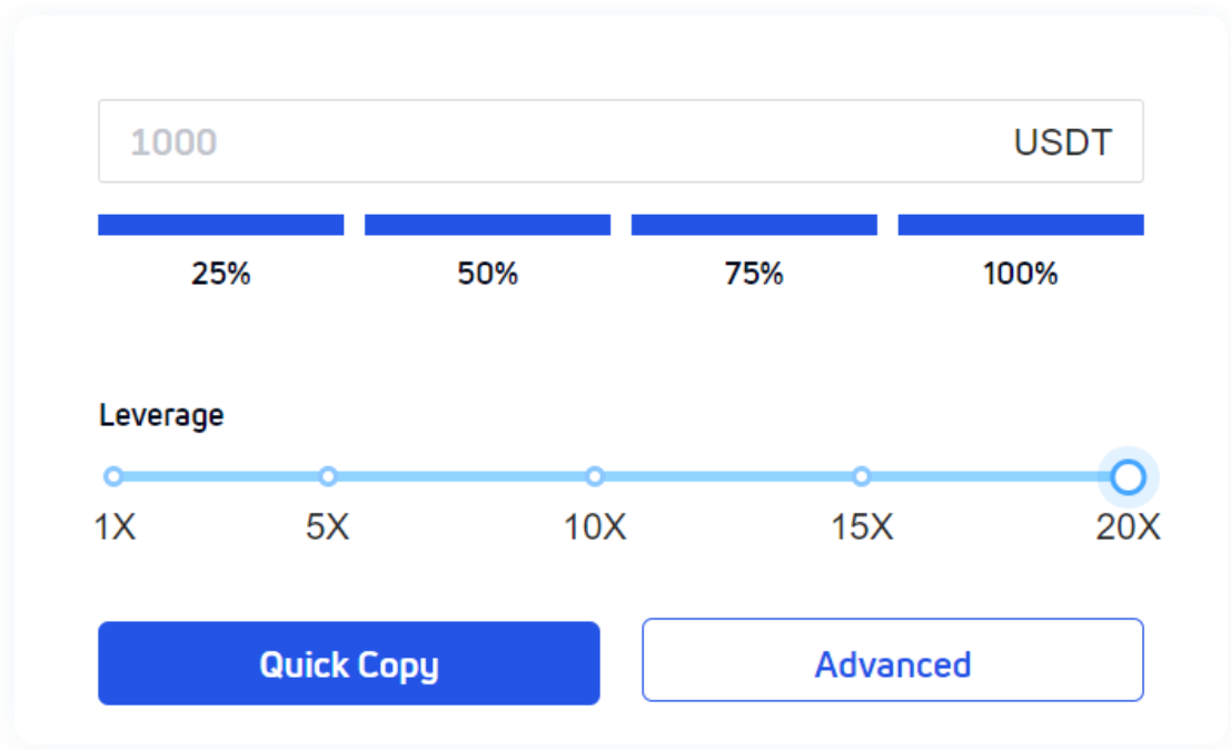<2> In this mode, the copier will completely follow the lead trader's trading parameters, with no need to set the trading leverage, who will completely follow the leverage used by the lead trader. If the lead trader uses 100X leverage, the copier will also use 100X leverage. Besides, the copier can break through the original 20X leverage limit of BTC/ETH, which, however, has a high risk, so copiers should copy with caution.