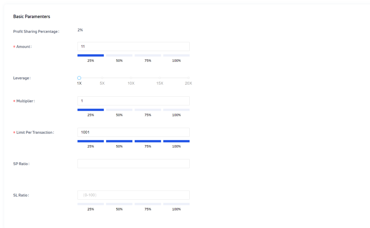 Copy Multiple Rate: This is mandatory, the range is 0.01-100, the number of copies of futures by the user = the number of futures placed by the trader * the copy multiple rate.