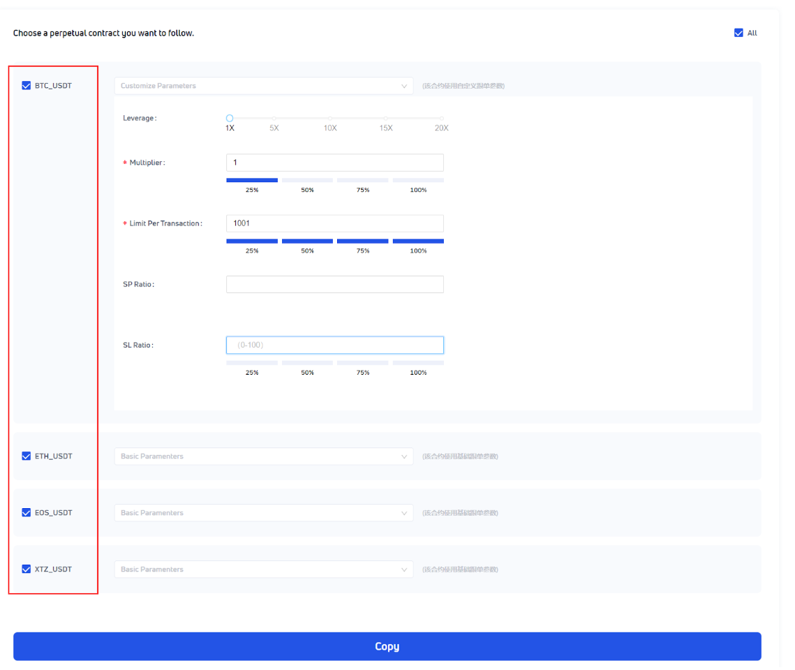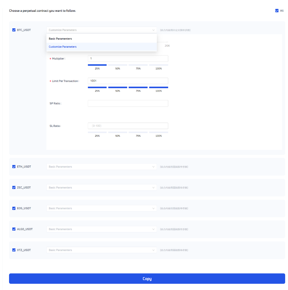 On the [Copy Settings] page, you can set the copy amount and allow users to select the copy future. Also, you can set different parameters for each future such as the copy amount, leverage multiple, copy multiple rate, amount limit for a single copy, take profit ratio, stop loss ratio and so on: