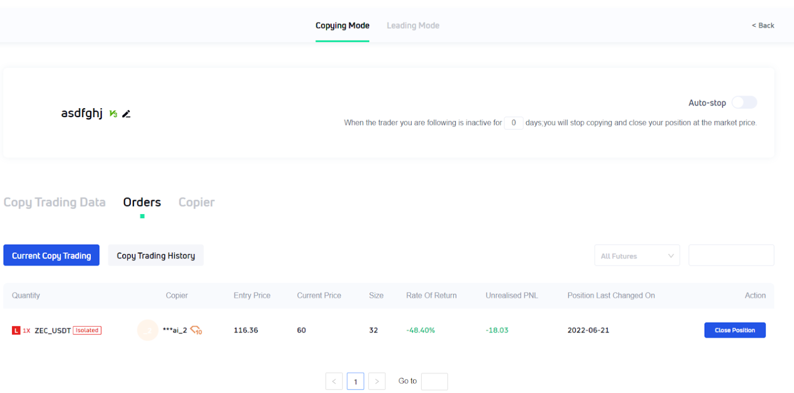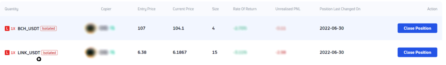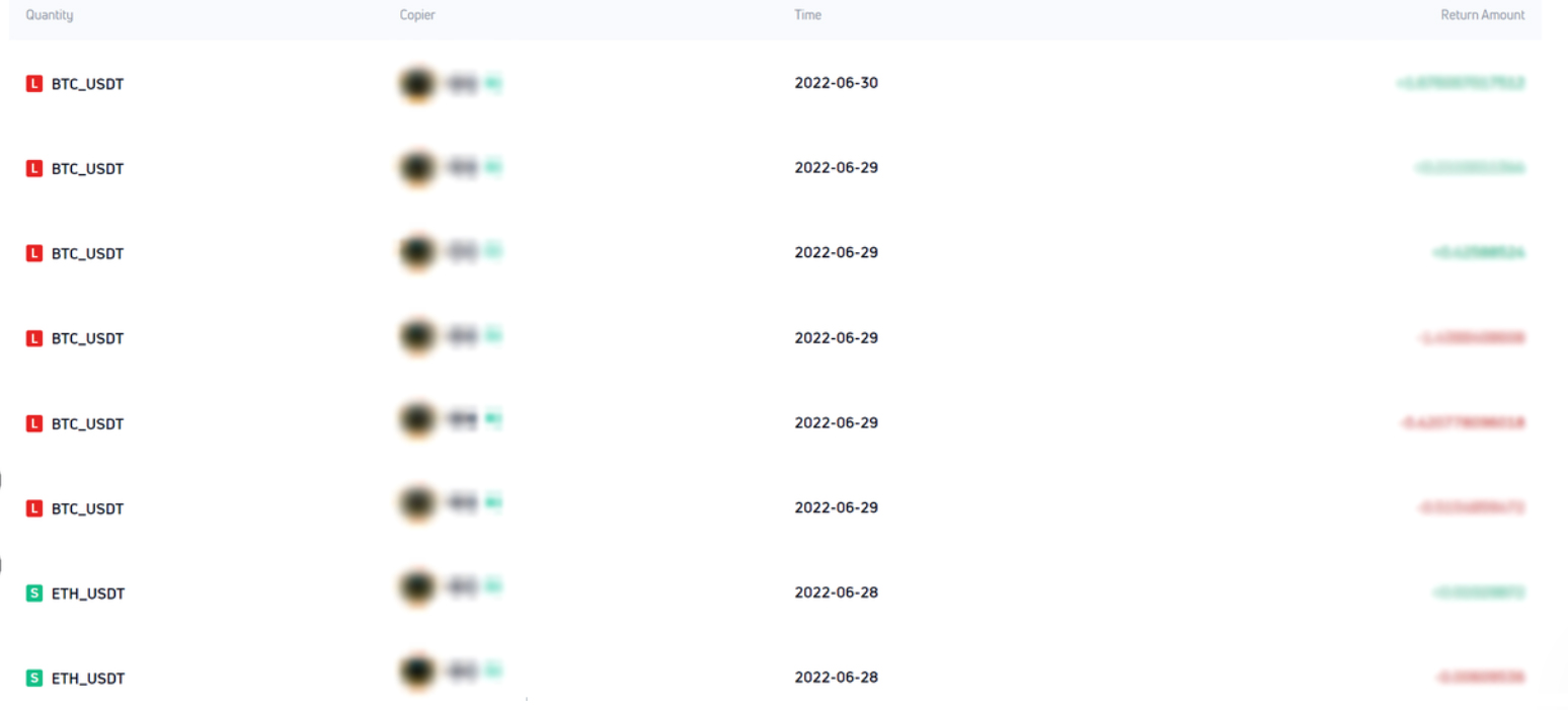 The copier completely follows the trader in accordance with his leverage multiple, cross margin/isolated margin mode, and selects all the futures led by the trader. Then follow the trader to open/add a position or close/reduce a position in accordance with the trader's fund proportion, which will makes the copier consistent with the trader in ROI.