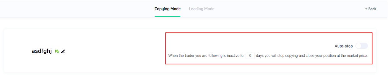 The user can customize the time interval of 1-30 days ([30] by default ), If the copier does not make a trade at the specified time (e.g. 30 days), the copy will be stopped and the copied future will be automatically closed at the market price.