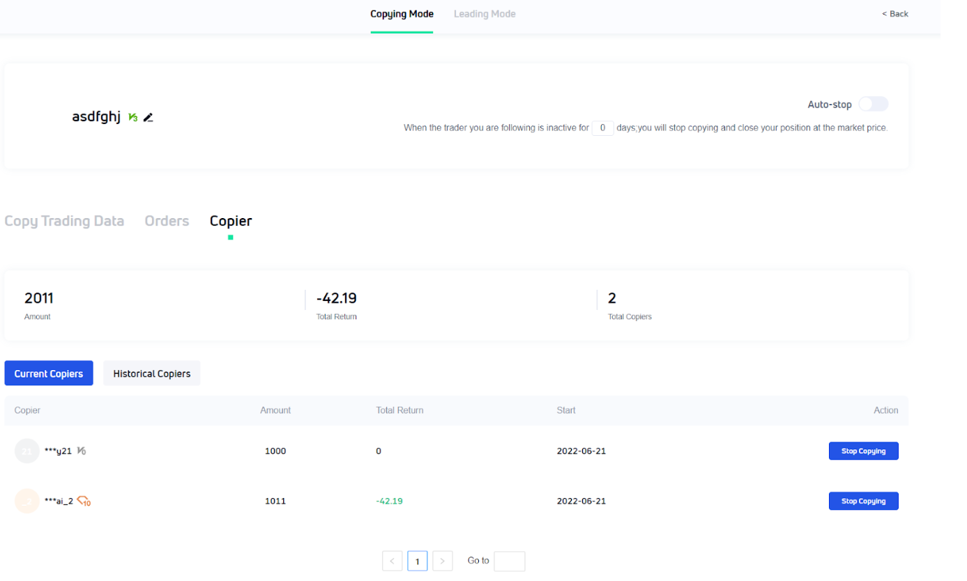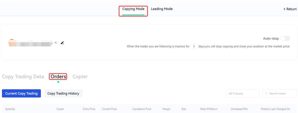 The copiers can perform the [Stop Copy] operation on the current copy trader in the current copy trader management in [Copy Mode], and it will no longer follow the traders and immediately close a position for the current future at the market price. Also, the profit-sharing settlement will be carried out and the remaining funds will be returned to the user's spot account, with the profit share of the trader issued before 10:00 am the next day.