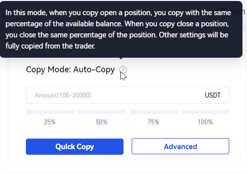<1> In this mode, the copier will follow the lead trader to open a position in accordance with their available fund proportion, and follow the the lead trader to close a position in accordance with their holding proportion, with the rest parameter settings completely copying the leader trader.