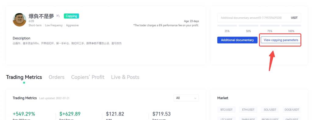 The specific process of the users under copying is shown in the figure above: enter copy trading home page - enter the corresponding "lead trader's homepage" - click "check the copying parameters" - select "start copying when the lead trader has no position"