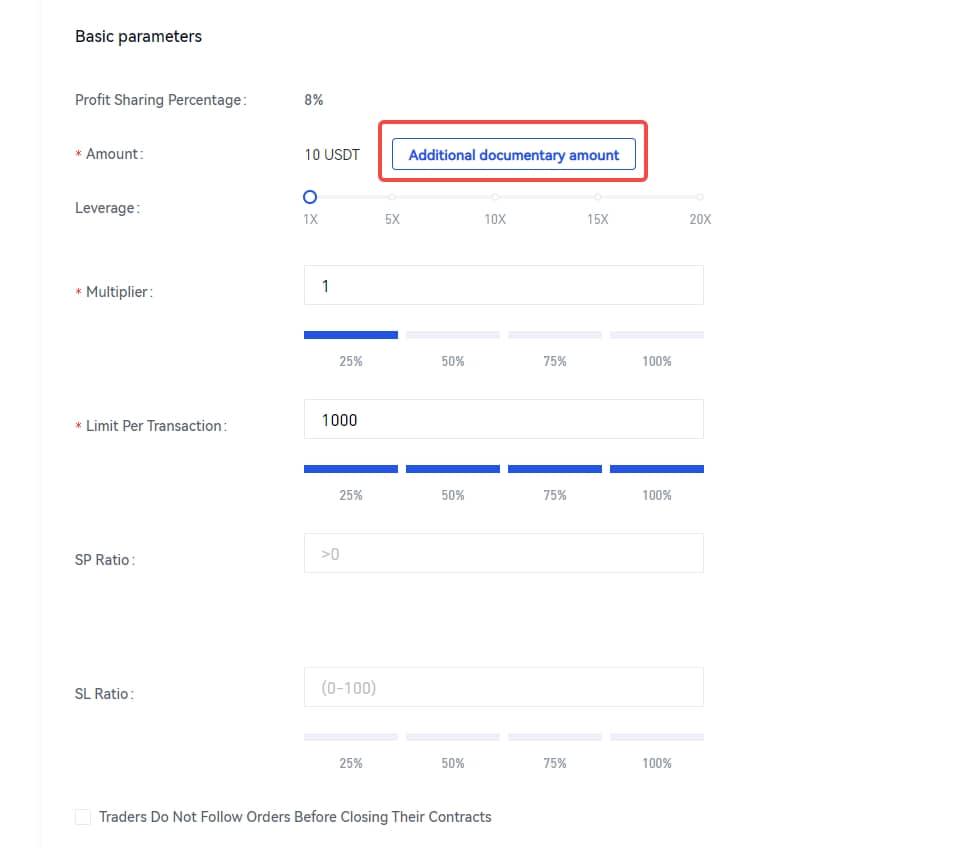 <5> Copiers used the copy multiplier, which refers to the multiple of the trader's position change. For example, if you set 10 times, the trader adds 10 futures and the copier will increase the position 10 * 10 = 100 futures, and the copy multiplier can be set between 0.01 and 100. It is recommended to set the copy multiplier according to the fund amount of copiers and the proportion of funds of traders. For example, when the interest of the traders is 1000usdt, and the copiers' fund is 100usdt, it is recommended to set the copy multiplier to 0.1 (100/1000), and the copier's fund is 5000usdt. The copy rate can be set to 5 (5000/1000=5).