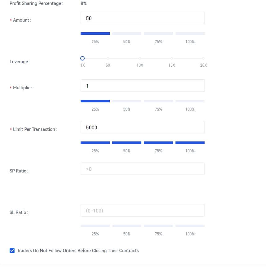Copy Amount: This is mandatory, that is, the total amount that the user copies the trader, and the amount range will vary according to the level of the trader being copied.