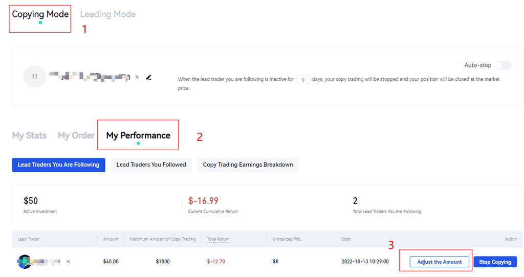 Copiers can enter "My Copy Trading" - "Copying Mode", and click "My Performance" to check your trades. Then click the homepage of the lead trader you are following and click "Adjust the Amount” to transfer out the return amount.