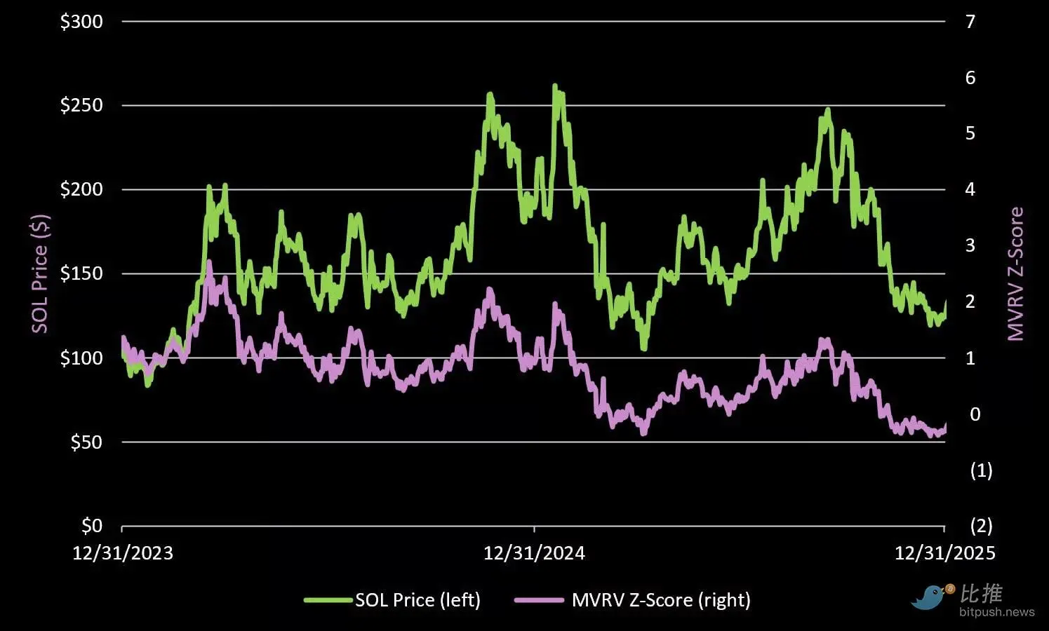 Do ponto de vista de “valor justo”, o preço de negociação atual do SOL está abaixo do seu preço realizado de 145 dólares (Realized Price, um indicador alternativo ao custo de aquisição de todos os tokens na rede), com um MVRV de 0,95. Na baixa do mercado de 2022, o SOL chegou a cair até o preço realizado.