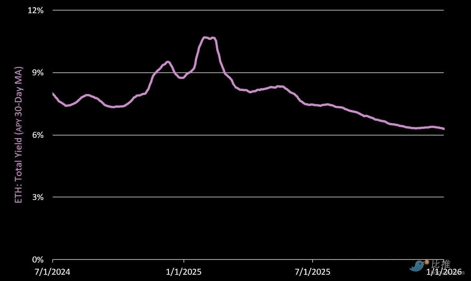 A taxa de retorno anualizada combinada, incluindo recompensas de emissão de protocolo, é de 6,7%. É importante notar que 93% desse retorno provém de novas emissões de tokens SOL. Como as taxas prioritárias e o MEV caíram 55%, o retorno total caiu de 7,64% no Q3.