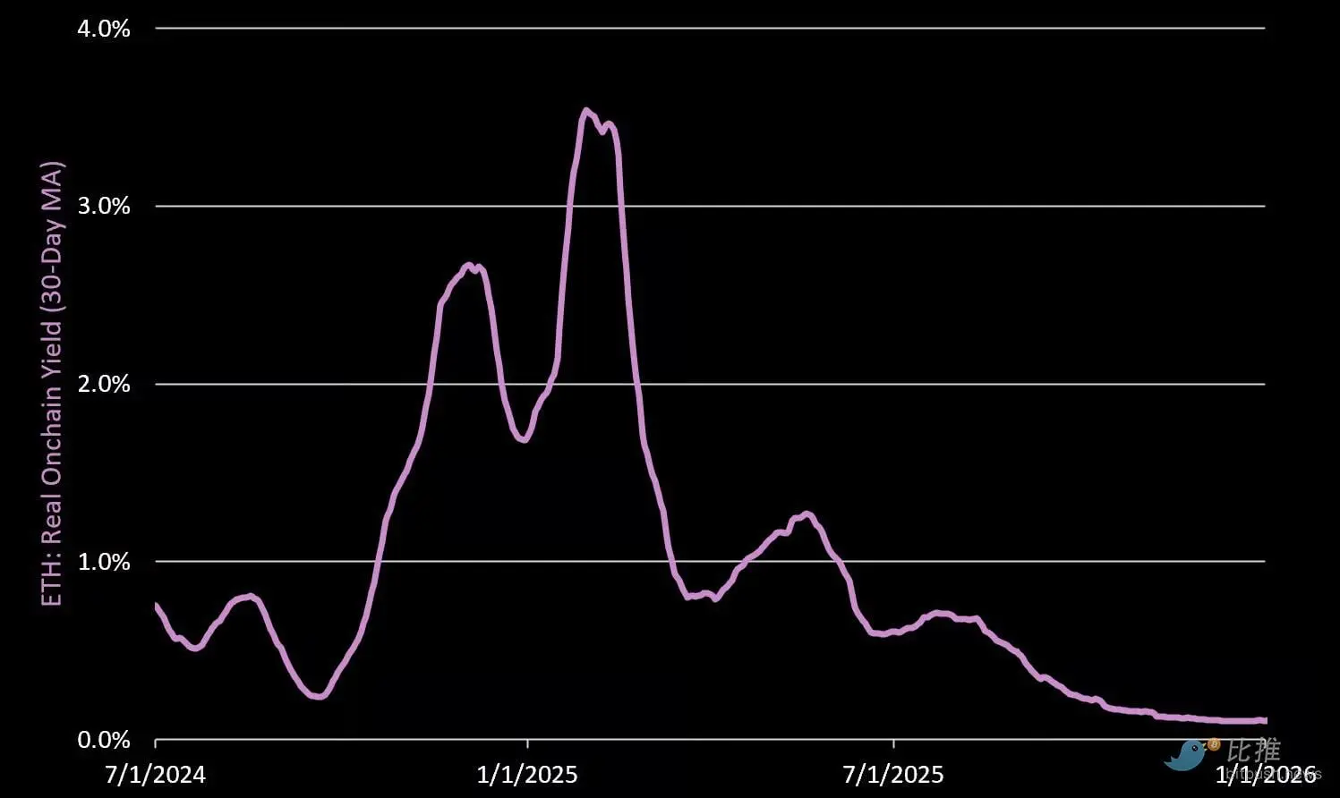A taxa de retorno real na cadeia no Q4 (annualizada) foi de apenas 0,46%, uma diminuição de 56% em relação ao trimestre anterior. Destes, 72% vêm de taxas prioritárias, e 28% de MEV. A diminuição na proporção de MEV reflete uma redução significativa na competição na cadeia (ou seja, na procura especulativa) neste trimestre.