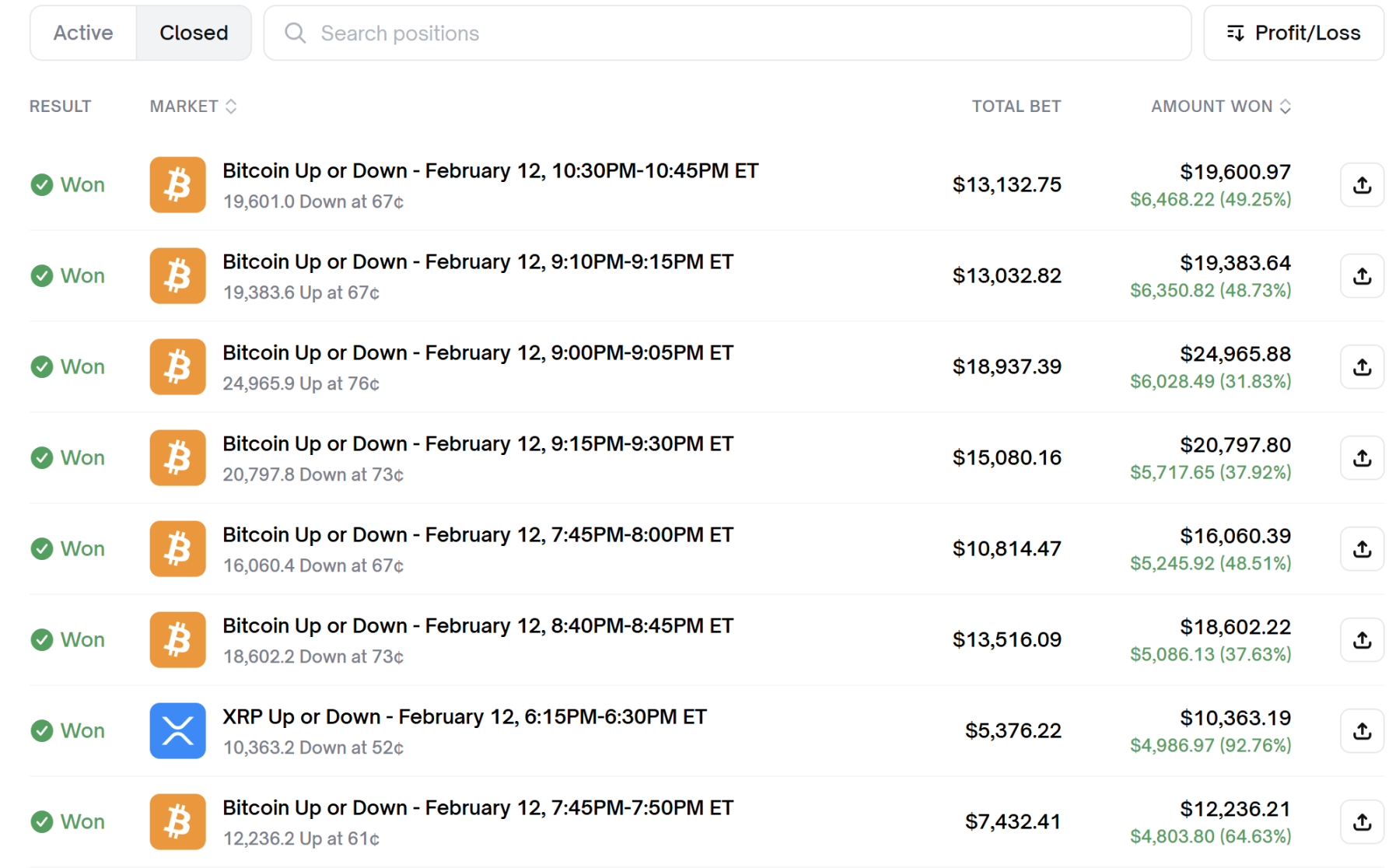 Ao analisar uma captura de tela de seus lucros, percebe-se um padrão surpreendente: apostas de valores elevados. Seus ganhos por operação variam entre 7.000 e 19.000 dólares. Além disso, seus lucros são bastante consistentes, quase sempre entre 4.800 e 6.400 dólares por operação.