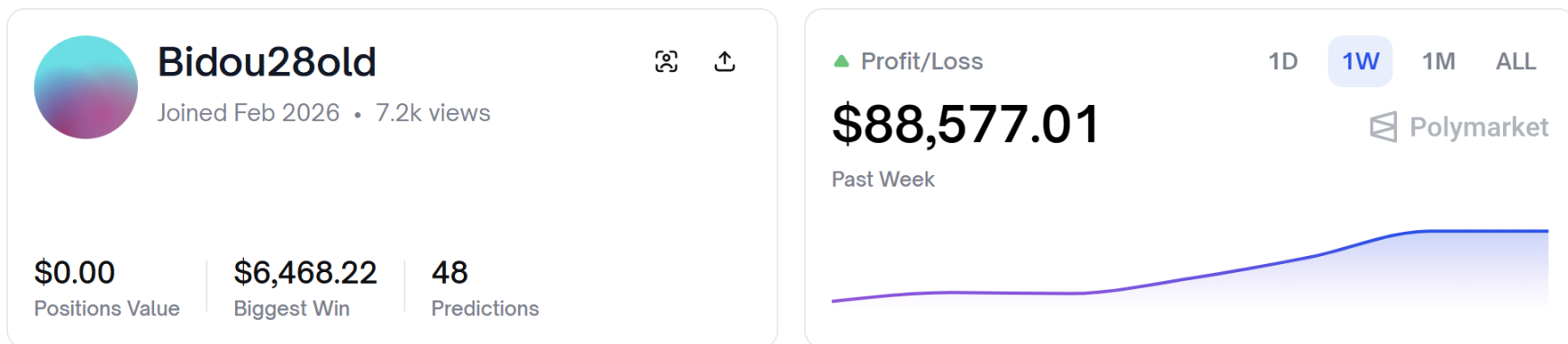 O jogador conhecido como Bidou28old (0x4460bf2c0aa59db412a6493c2c08970797b62970) no Polymarket, que entrou em fevereiro deste ano, lucrou quase 80 mil dólares em menos de um dia.
