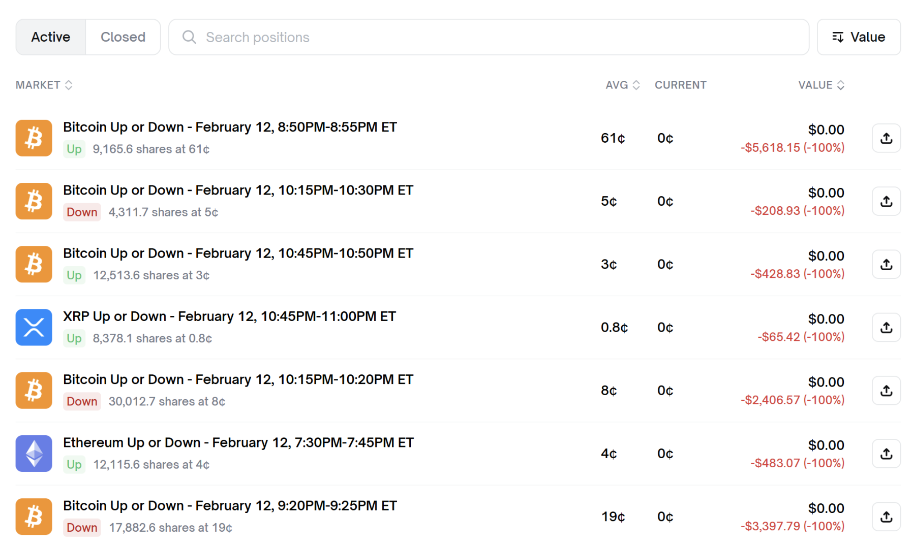 Para a maioria, isso é fracasso; para ele, é lógica matemática. Observando alguns preços de entrada: 3¢, 5¢, 8¢, 0,8¢. No Polymarket, ele compra especificamente eventos com probabilidade estimada de 3% a 8% (por exemplo, comprar “rebound em 5 minutos” durante uma queda drástica do BTC).