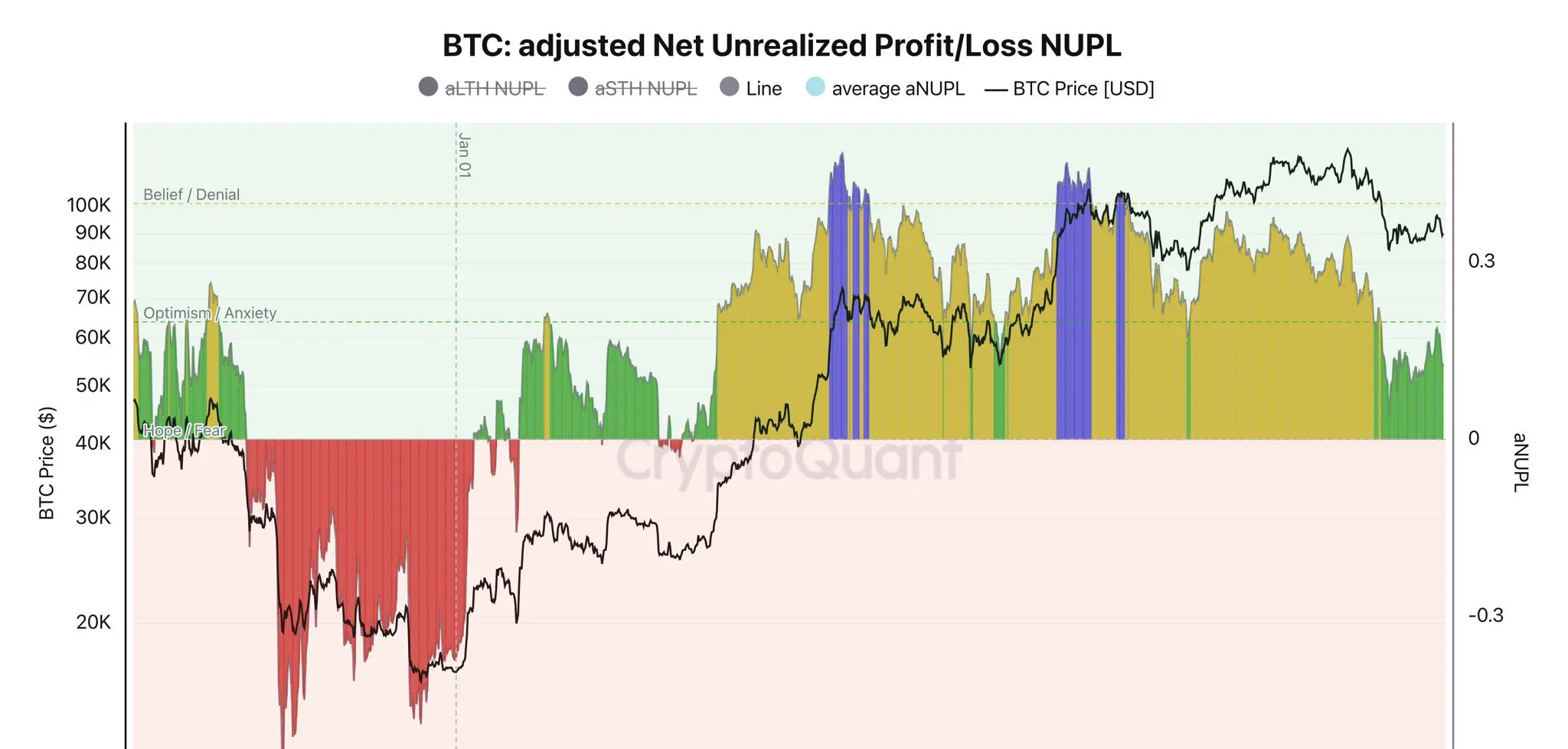 No centro desta análise está uma versão ajustada do indicador de Lucro/Perda Não Realizado Líquido, frequentemente referido como aNUPL. Ao contrário do indicador NUPL tradicional, esta versão incorpora a capitalização realizada de detentores de curto prazo e de longo prazo, comparando esse valor combinado com a capitalização de mercado do Bitcoin. O resultado é então suavizado para refletir melhor o sentimento geral dos investidores, em vez de ruído de curto prazo.