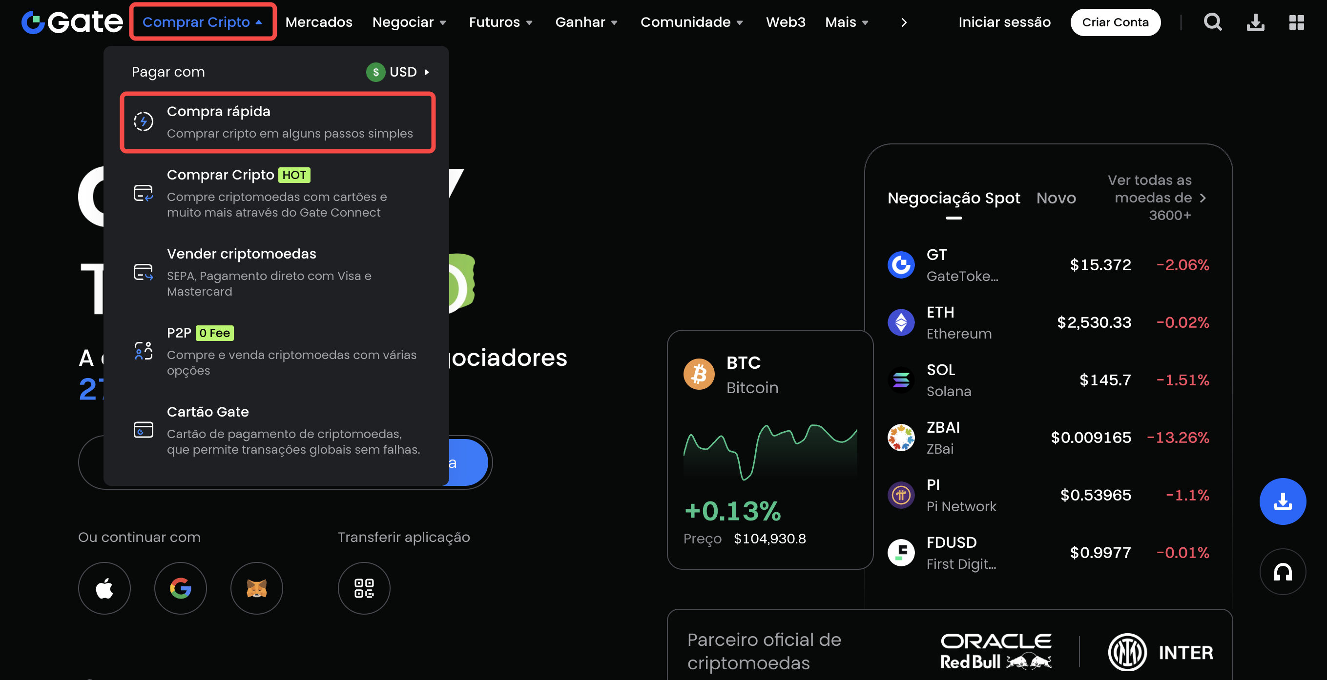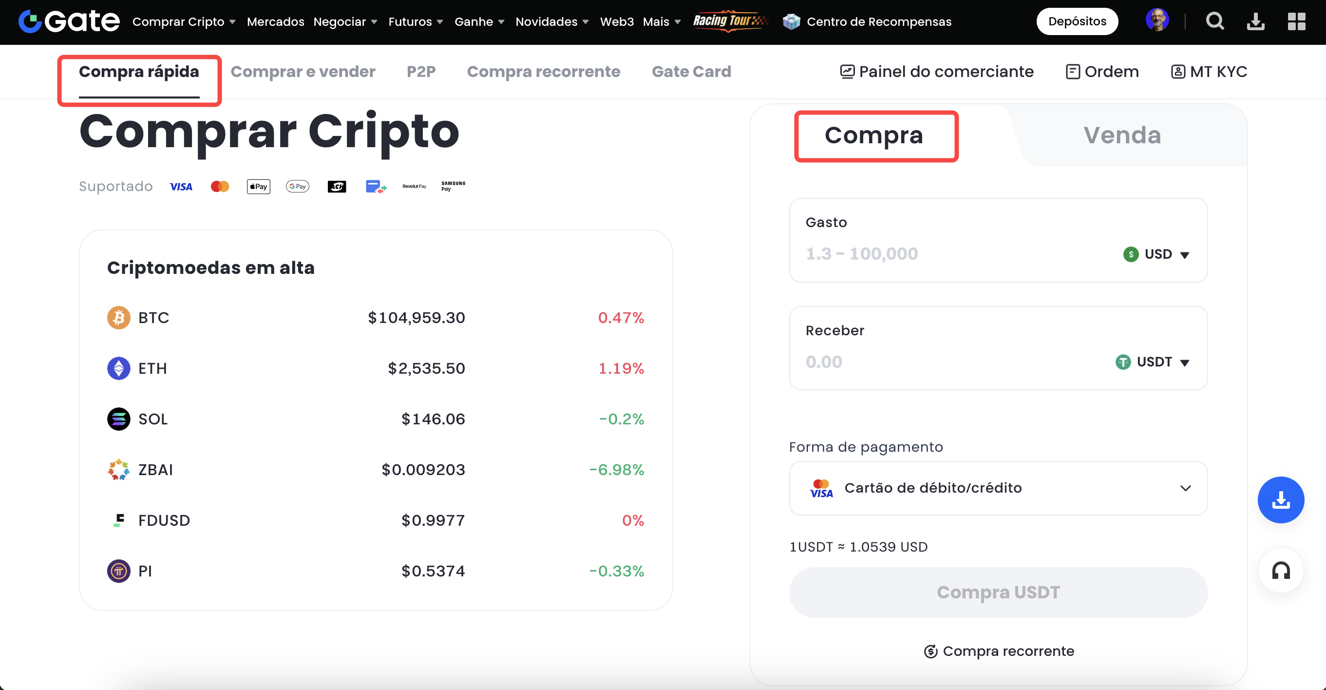 1. Faça login na sua conta da Gate e vá em “Compre Cripto”- “Compra rápida”.
