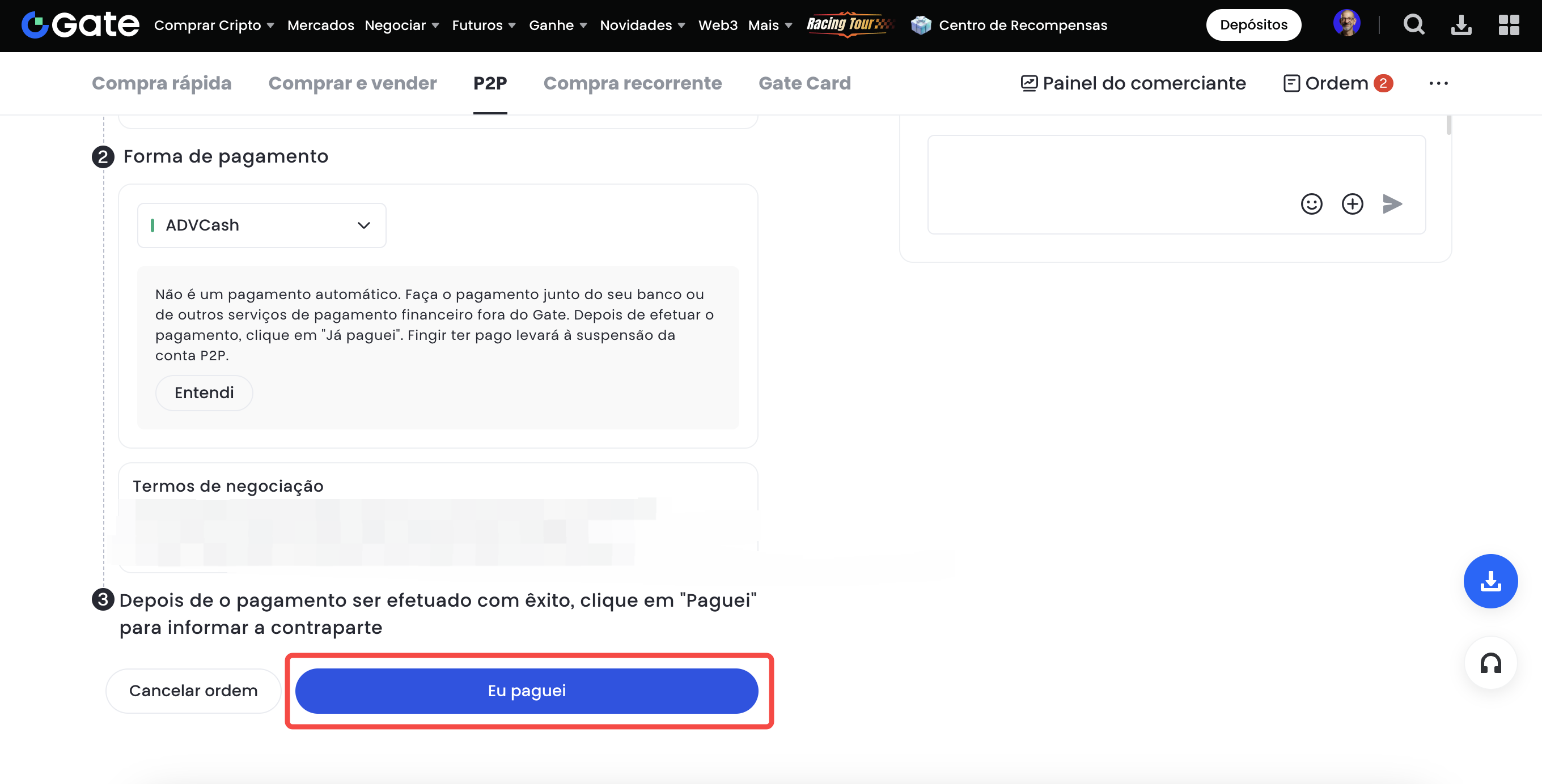 Observação: Não é um pagamento automático. Por favor, faça o pagamento usando seu banco ou outros serviços de pagamento financeiro fora da Gate. Quando tiver feito o pagamento, clique em “Já paguei”. Fingir ter pagado ao vendedor vai levar à suspensão da conta de P2P.