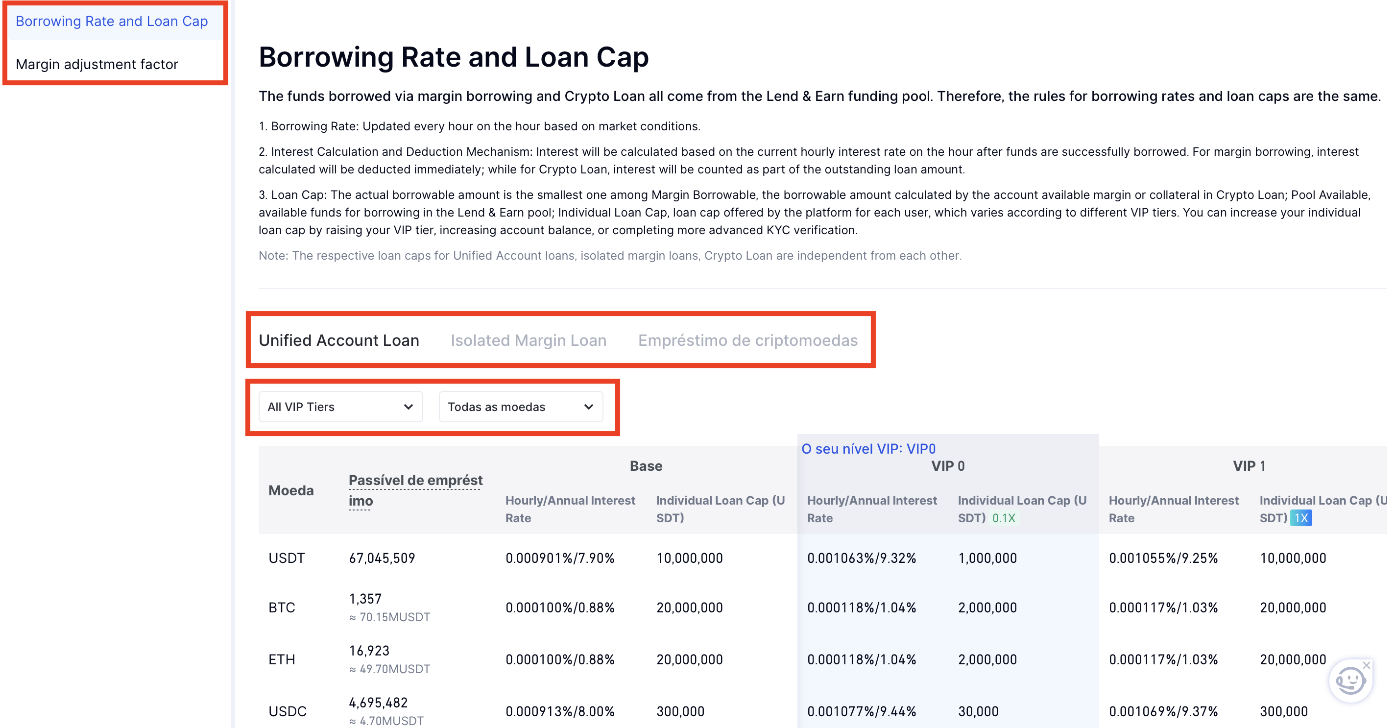 Visualize o fator de ajuste de margem e o fator de empréstimo das moedas emprestadas clicando em "Ver mais informações sobre as taxas de mercado"!