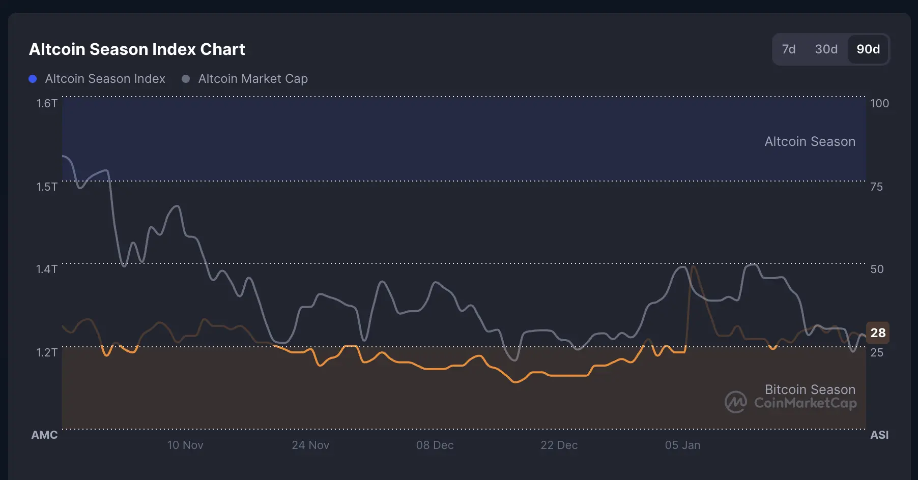 A Temporada do Bitcoin persiste, com o Índice de Temporada de Altcoins não sinalizando subida rumo ao limiar de 75 que indicaria rotação ampla de altcoins. O capital permanece seletivo, concentrando-se em projetos com utilidade demonstrada e catalisadores específicos.