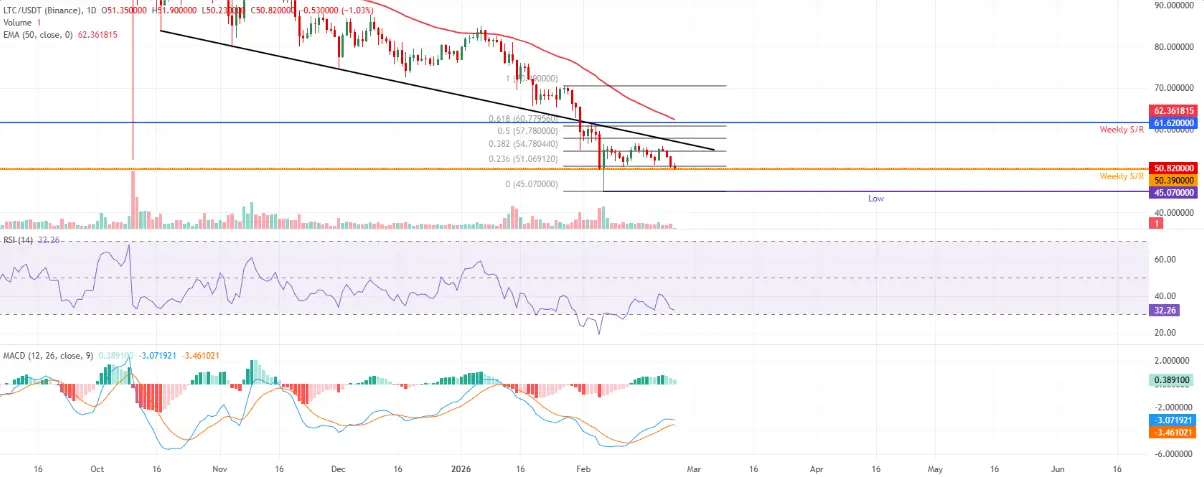 Na quarta-feira, o preço do Litecoin oscila em torno de 50,39 USD. A média móvel exponencial (EMA) de 50 dias continua a apontar para baixo, atualmente em 62,36 USD, consolidando o cenário de tendência de baixa, já que o preço permanece abaixo dessa resistência. Cada tentativa de recuperação se enfraquece rapidamente ao se aproximar da EMA de 50 dias, indicando que os compradores ainda não têm força suficiente para uma reversão confiável.