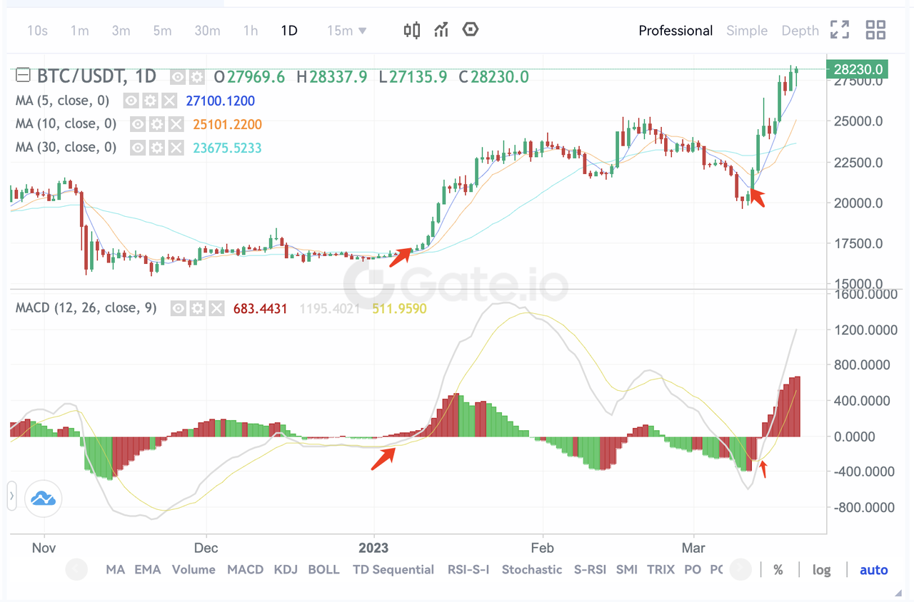 ①. Когда DIF и DEA находятся выше оси 0, а DIF пробивается выше DEA, это указывает на сильный импульс текущего бычьего движения и можно ожидать неминуемого роста. Ситуация предполагает, что пользователи могут увеличить свои позиции или сохранить активы в ожидании повышения курса. Это пересечение известно как золотой крест MACD. Ниже показан пример паттерна:
