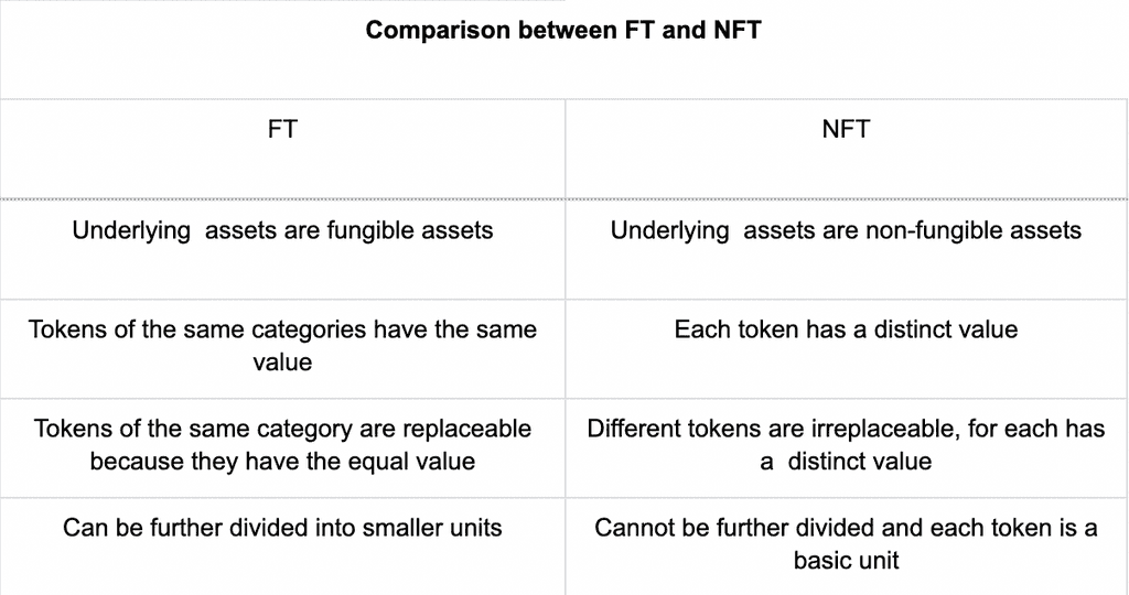 Напротив, FT (взаимозаменяемый токен) может быть заменен, является однородным и может быть разделен на бесконечное число частей. Типичный FT включает в себя BTC и ETH.