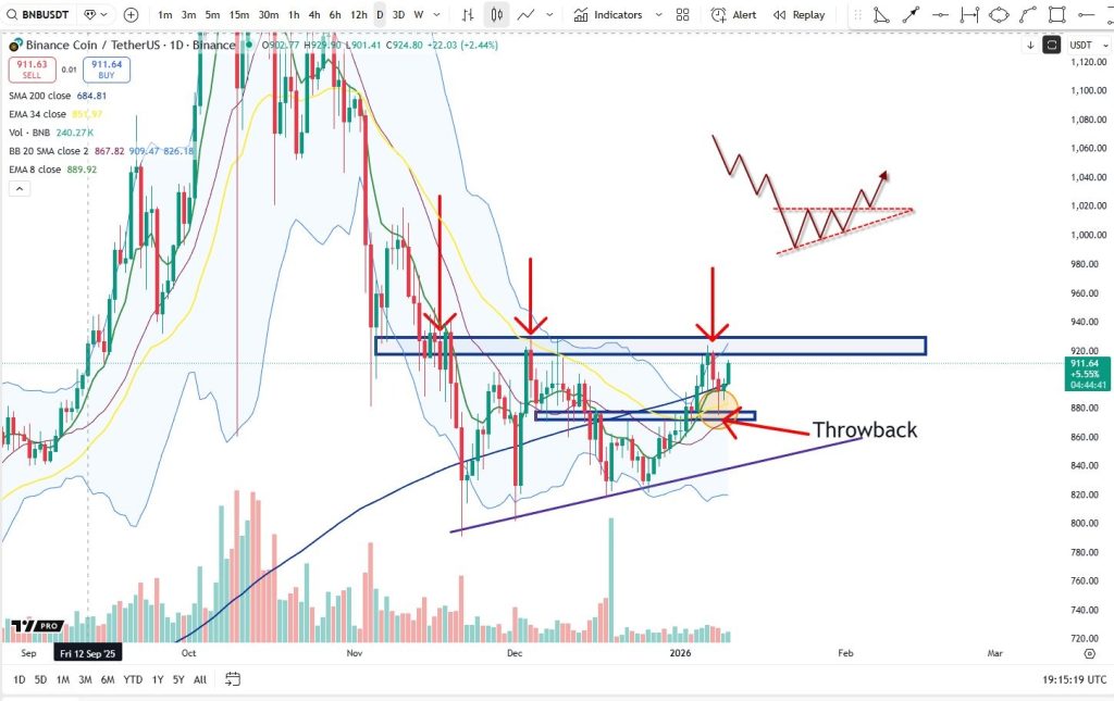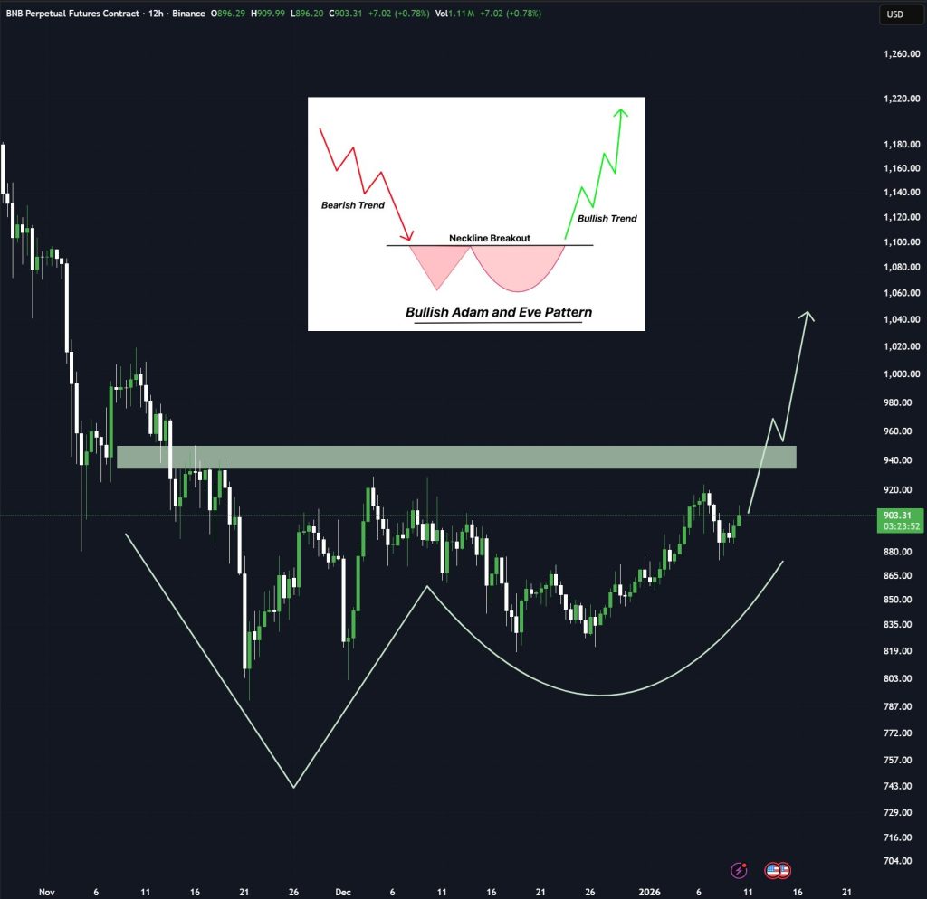 Если эта структура разрешится вверх, прогноз по цене BNB указывает на чистый пробой выше $930, за которым последует движение в диапазон $960–$980 . Это тот сценарий, который трейдеры обычно ожидают после пробоя этого паттерна.