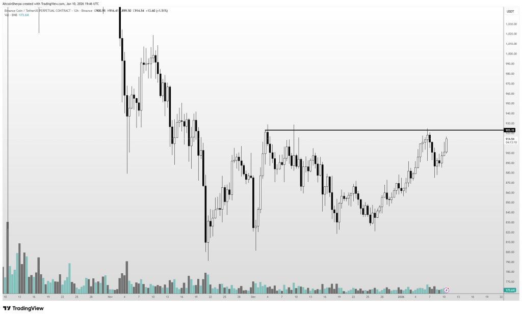 Altcoin Sherpa придерживается простого и дисциплинированного подхода. Вместо того чтобы пытаться предсказать пробой, он ждет подтверждения. На 12-часовом графике цена BNB все еще ограничена той же зоной сопротивления $923–$930 , которая останавливала ралли несколько раз.