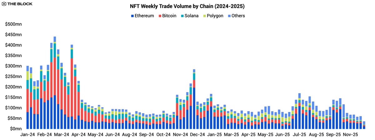 Фактически, отчёт The Block за 2025 год показывает, что за год на рынок NFT не поступило значительных новых инвестиций, спекулятивный ажиотаж значительно снизился, а многосетевой разнородный рынок вернулся к доминированию Ethereum.