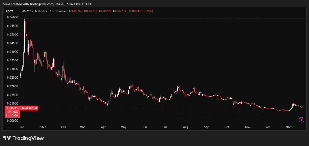 Цена JASMY большую часть 2025 года колебалась без ясного катализатора. Эта фаза создала впечатление, что развитие замедлилось. Запуск цепочки Jasmy опровергает это предположение. Инфраструктурные дополнения часто не отражаются сразу в цене, но меняют то, как будущие циклы оценивают надежность проекта.
