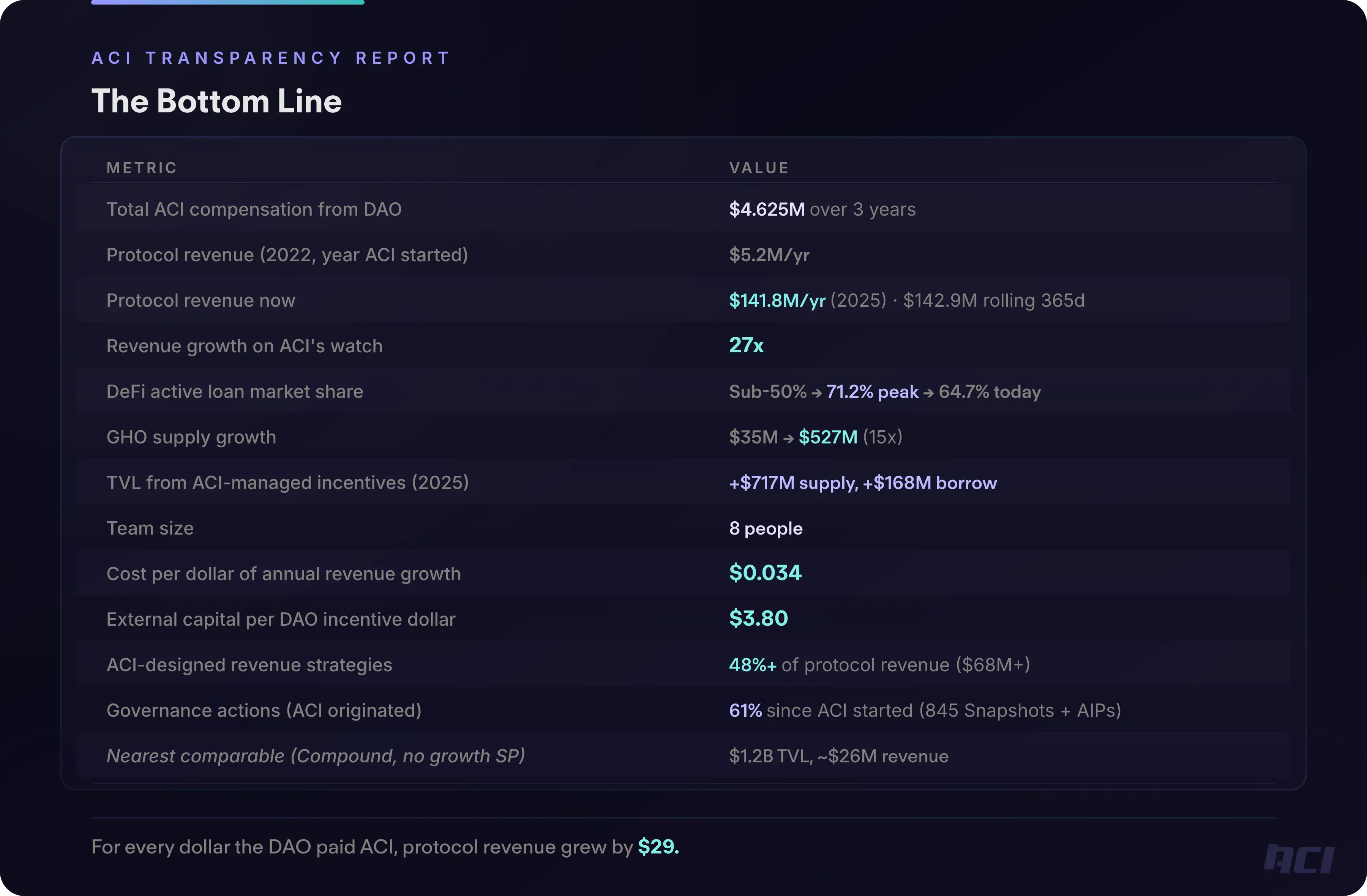 Каждый доллар, выплаченный DAO ACI, принес рост доходов протокола на 29 долларов. Мы не единственные — BGD поддерживает кодовую базу, Chaos Labs управляет рисками, TokenLogic занимается казной, анализом данных и руководит BD и институциональной торговлей, а рыночная среда тоже важна. Но кто-то должен превращать инфраструктуру в доход — это наша работа.