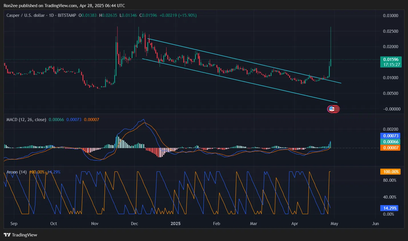! Chart 1- CSPR/USDT MACD และ Aroon Chart เผยแพร่บน TradingView วันที่ 28 เมษายน 2025