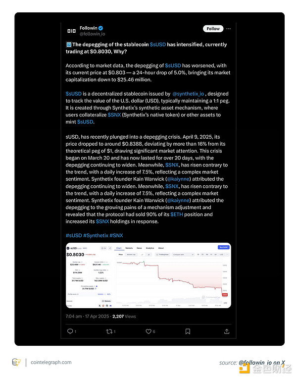 เกิดเหตุการณ์ที่สำคัญและน่ากังวลในวงการสกุลเงินดิจิทัล: มูลค่าของเหรียญ Stablecoin พื้นเมือง sUSD ของโปรโตคอล Synthetix ตกต่ำลงเหลือ 0.68 ดอลลาร์ในวันที่ 18 เมษายน 2025.