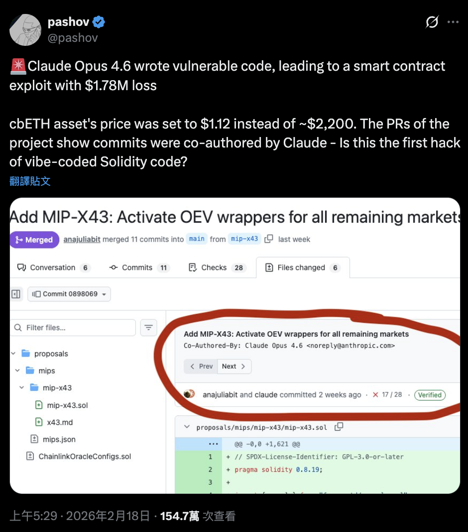 เหตุการณ์นี้กลายเป็นประเด็นร้อนในชุมชน ไม่ใช่เพราะจำนวนเงินที่เสียไป แต่เป็นเพราะกระบวนการเขียนโค้ดเบื้องหลัง Pashov นักบัญชีด้านความปลอดภัยบล็อกเชน ได้ออกมาเปิดเผยบนแพลตฟอร์ม X ว่า โค้ดสำคัญที่ทำให้เกิดช่องโหว่นี้ดูเหมือนจะเป็นผลงานร่วมกันระหว่างโมเดล AI ของ Anthropic ชื่อ Claude Opus 4.6 โดยการตรวจสอบ Pull Request 578 บน GitHub พบว่ามีหลาย Commit ที่ระบุว่าเป็นผู้ร่วมเขียนโดย Claude