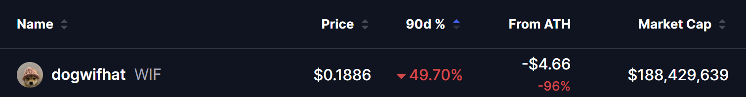 Dogwifhat (WIF) ลดลงเกือบ 46% ในช่วง 90 วันที่ผ่านมา และยังคงต่ำกว่าจุดสูงสุดตลอดกาลที่ 4.64 ดอลลาร์ ถึง 96%