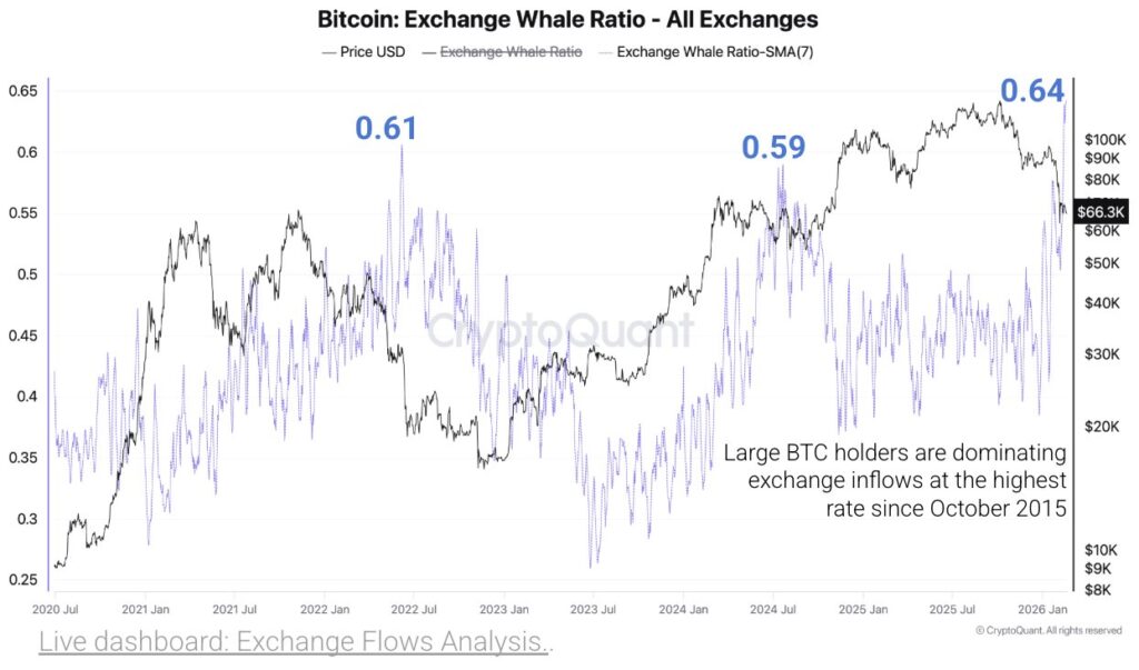 อิงข้อมูลล่าสุดจาก CryptoQuant อัตราเครือข่ายวาฬเทรดบน (Exchange Whale Ratio) ของ Bitcoin แตะระดับสูงสุดตั้งแต่ปี 2015 ที่ 0.64 เมื่อวันที่ 20 กุมภาพันธ์ 2026 ตัวชี้วัดนี้ติดตามสัดส่วนของการไหลเข้าจากกลุ่มใหญ่ที่สุด 10 อันดับแรกที่มีต่อยอดเงินฝากรวมของตลาด แสดงให้เห็นว่าผู้ถือครองขนาดใหญ่อยู่ในสัดส่วน 64% ของการไหลเข้าทั้งหมด