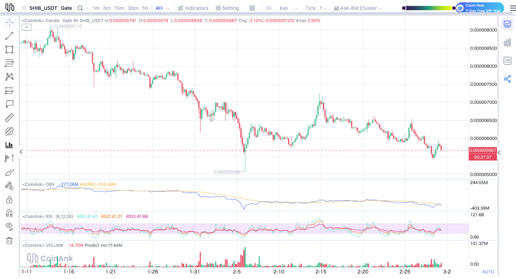 บนกราฟ 4 ชั่วโมง ราคาของ SHIB ยังคงอยู่ราวๆ $0.0000056 หลังจากสร้างรูปแบบสูงต่ำที่ลดลงอย่างต่อเนื่องตลอดเดือนกุมภาพันธ์ มีช่วงเวลาสั้นๆ ในต้นเดือนที่ราคาพุ่งขึ้นเหนือ $0.0000070 แต่การเคลื่อนไหวดังกล่าวไม่คงอยู่ ผู้ขายเข้ามาอย่างรวดเร็วและลบล้างการ breakout นั้น ทำให้ SHIB กลับลงมาอีกครั้ง