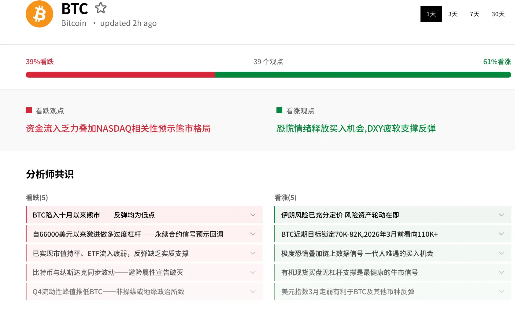 ในด้านออปชัน (ตัวเลือก) วันที่ 27 มีนาคม ราคาค่าความผันผวนแฝง (IV) พุ่งขึ้นแตะ 51.3% จุดเจ็บปวดสูงสุดอยู่ที่ 76,000 ดอลลาร์ ในปริมาณการถือครองรวมกว่า 167,000 BTC (มูลค่ากว่า 11.2 พันล้านดอลลาร์) อัตราส่วนการถือครองแบบวางขาย/ซื้อ (PCR) อยู่ที่ 0.75 แต่ปริมาณการซื้อขายใน 24 ชั่วโมงพุ่งขึ้นเป็น 1.37 สถานะอารมณ์ตลาดในปัจจุบันมีความแตกแยกอย่างมาก: ฝ่ายระยะยาวยังคงถือครองแนวโน้มขาขึ้นอย่างแข็งขัน ขณะที่นักเก็งกำไรระยะสั้นก็กำลังซื้อออปชันวางขายในช่วง 67,000-70,000 ดอลลาร์อย่างบ้าคลั่งเพื่อป้องกันความเสี่ยง ตามข้อมูลจาก unbias ขณะนี้ 61% ของนักวิเคราะห์มองแนวโน้มเป็นบวกในระยะสั้น