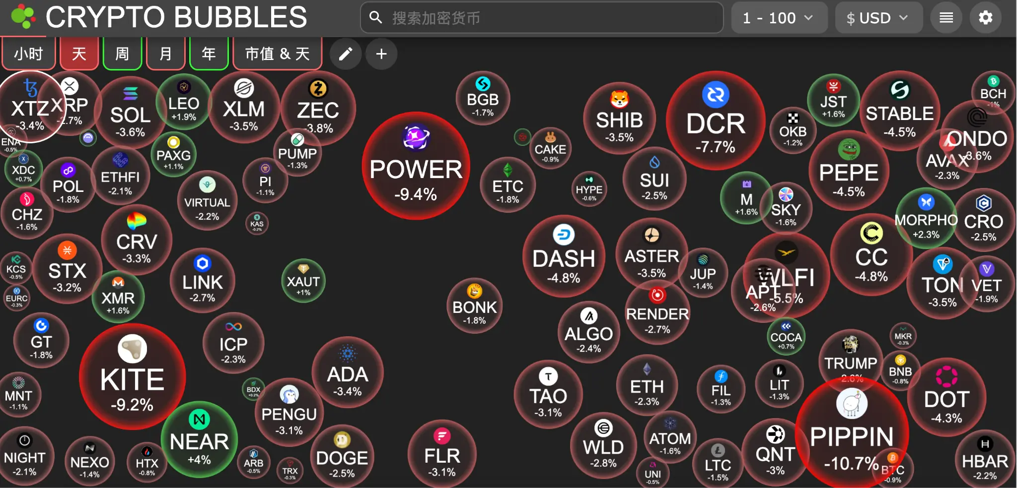 เหรียญใน 100 อันดับแรกตามมูลค่าตลาดวันนี้ ราคาตกสูงสุด: Power Protocol -9.4%, Decred -7.7%, Stablecoin -10.7%, Internet Computer -9.2%, MemeCore -5.5%