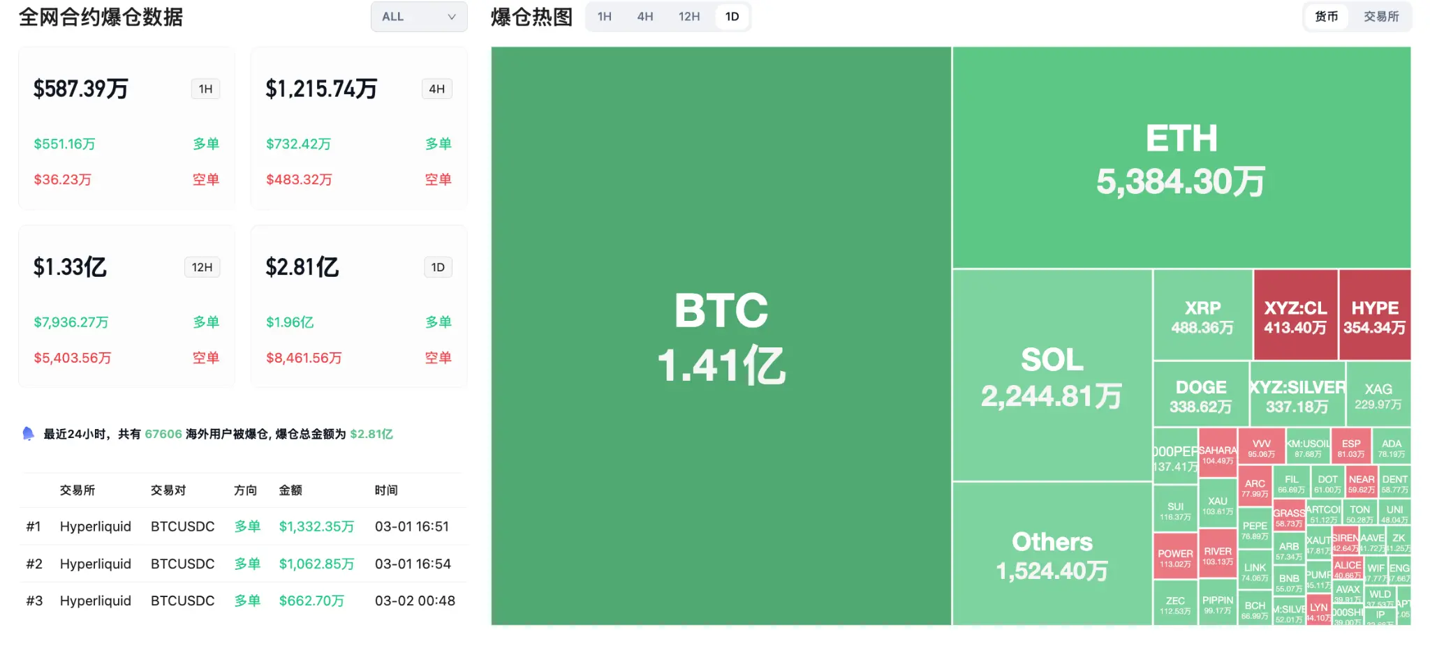 มีผู้ถูกล้างพอร์ตในตลาดรวม 67,606 ราย มูลค่ารวม 281 ล้านดอลลาร์ โดย BTC ล้างพอร์ต 141 ล้านดอลลาร์ ETH ล้างพอร์ต 53.84 ล้านดอลลาร์ SOL ล้างพอร์ต 22.44 ล้านดอลลาร์
