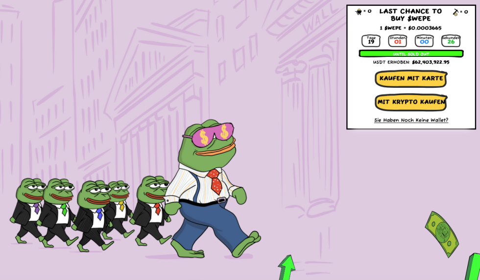 นี่คือเหรียญ Meme ที่แท้จริงและใหม่ที่สุดซึ่งได้รับประโยชน์จากความยอดเยี่ยมที่มีขึ้นเรื่อย ๆ ในสัปดาห์และเดือนที่ผ่านมาจากความยอดเยี่ยมในส่วนของเหรียญ Meme ในขณะนี้ WEPE มีจำหน่ายเฉพาะทางเว็บไซต์อย่างเป็นทางการและวิดเจ็ต Presale ที่ตั้งอยู่ที่นั่น นั่นหมายความว่าเหรียญนั้นยังไม่สามารถซื้อขายในตลาดเปิดได้ แต่สามารถซื้อได้ที่ราคาที่ลดราคาล่วงหน้าเท่านั้น นักลงทุนได้รับโอกาสในขณะนี้ที่จะซื้อ WEPE เพียง 0.0003665 $