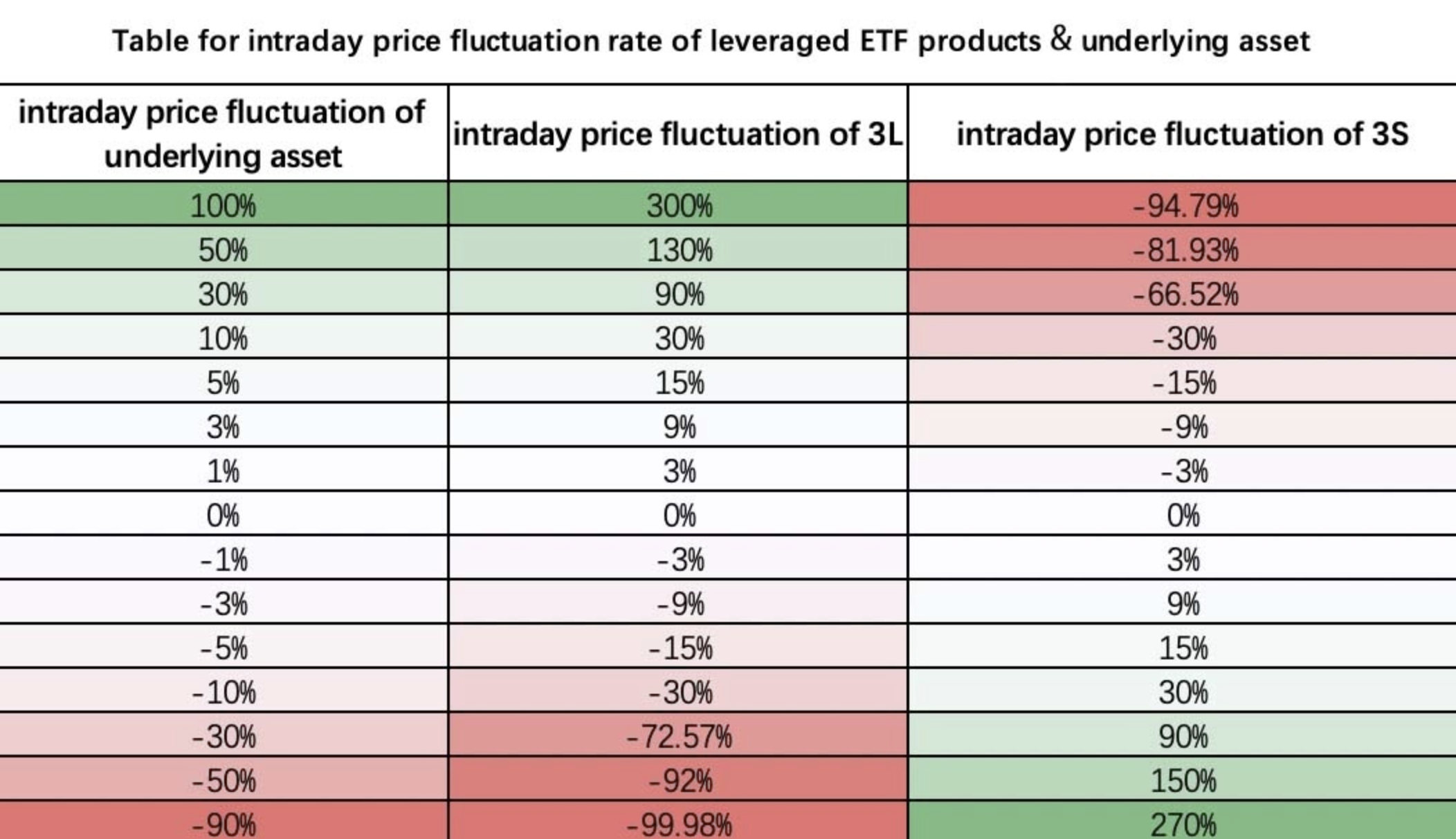 Kaldıraçlı ETF ürünlerinin fiyat dalgalanmaları, NAV değişimine yansıtılan temel para biriminin fiyat dalgalanmalarının 3 kez amplifikasyonudur. Örneğin BTC, BTC3L ve BTC3S'nin temel para birimidir. Bir işlem gününde belirli bir zaman diliminde BTC'nin fiyatı (00:00'daki fiyat açılış fiyatıdır) ve ilgili zaman diliminin NAV'ı aşağıdaki gibidir: BTC fiyatı %1 artar, BTC3L'nin NAV'ı %3 artar, BTC3S'nin NAV'ı %3 azalır; BTC fiyatı %1 düşer, BTC3L'nin NAV'ı %3 azalır, BTC3S'nin NAV'ı %3 artar.