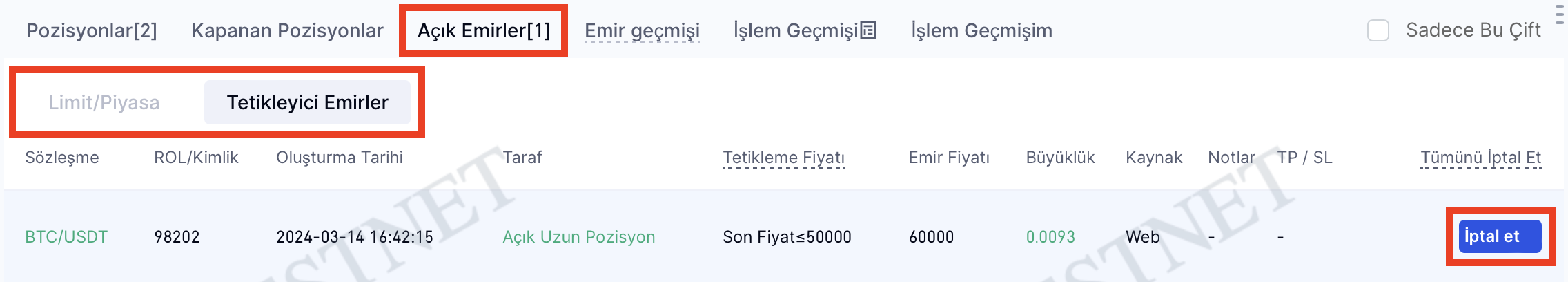 - Tetiklendiğinde, sistem planlanan emrin geçerliliğini kontrol edecek ve emir listesinde bir emir oluşturacaktır. Koşullu sıranın “kapat/tetikte aç” sırasını ayarlayabilirsiniz. (Giriş tetikleme fiyatı son fiyat/marka fiyatından büyükse >= ve giriş tetikleme fiyatı son fiyat/marka fiyatından küçükse <= olur).