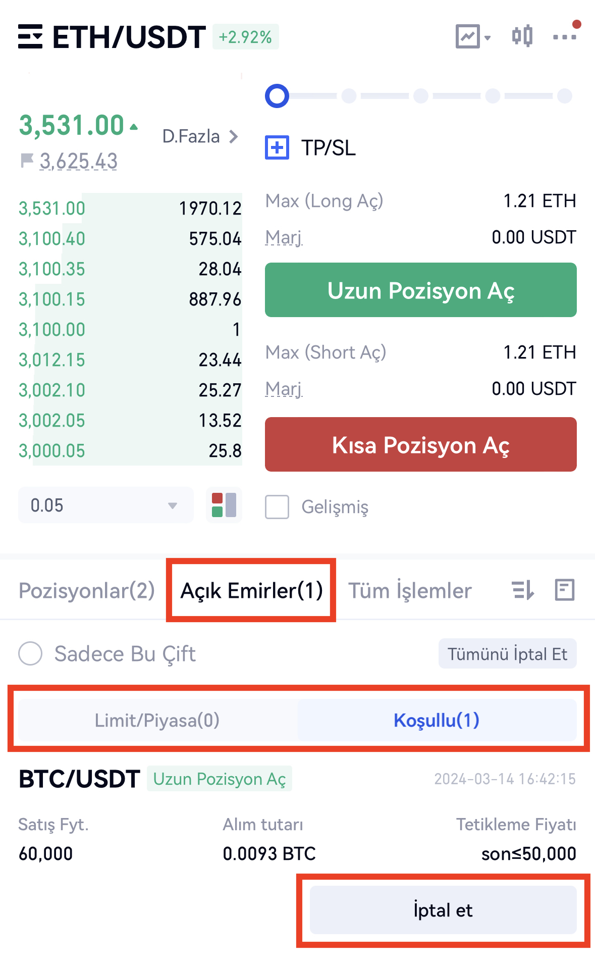 Emir verildikten hemen sonra veya tam olarak karşılanmıyorsa, “Açık Emirler”in “Limit/Piyasa” bölümünden kontrol edebilirsiniz. Emri iptal etmek için İptal'e de tıklayabilirsiniz.