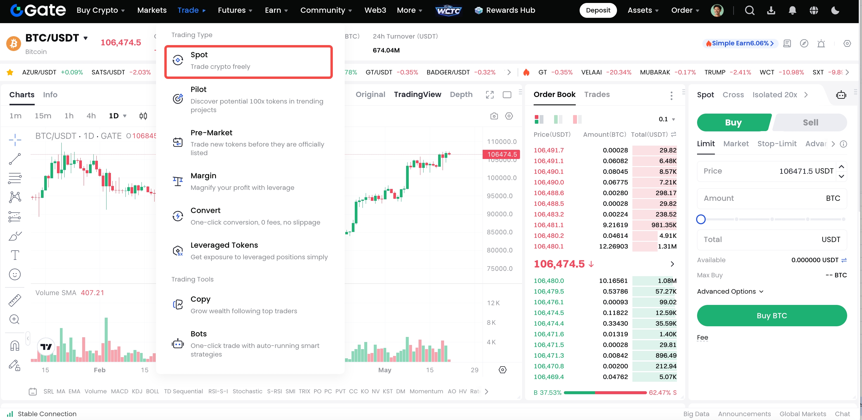 Adım 1: Hesabınıza giriş yapın. Üst gezinme çubuğunda 'Ticaret' altında 'Spot' üzerine tıklayın.