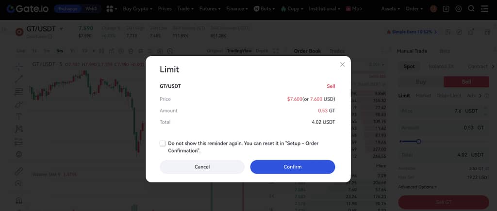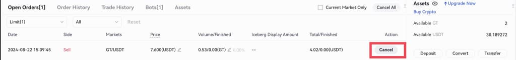 Adım 5: Bir emir başarıyla yerleştirildikten sonra, dolmadan önce açık emir bölümünde görüntüleyebileceksiniz. Ayrıca burada "İptal"e tıklayarak emri iptal edebilirsiniz.