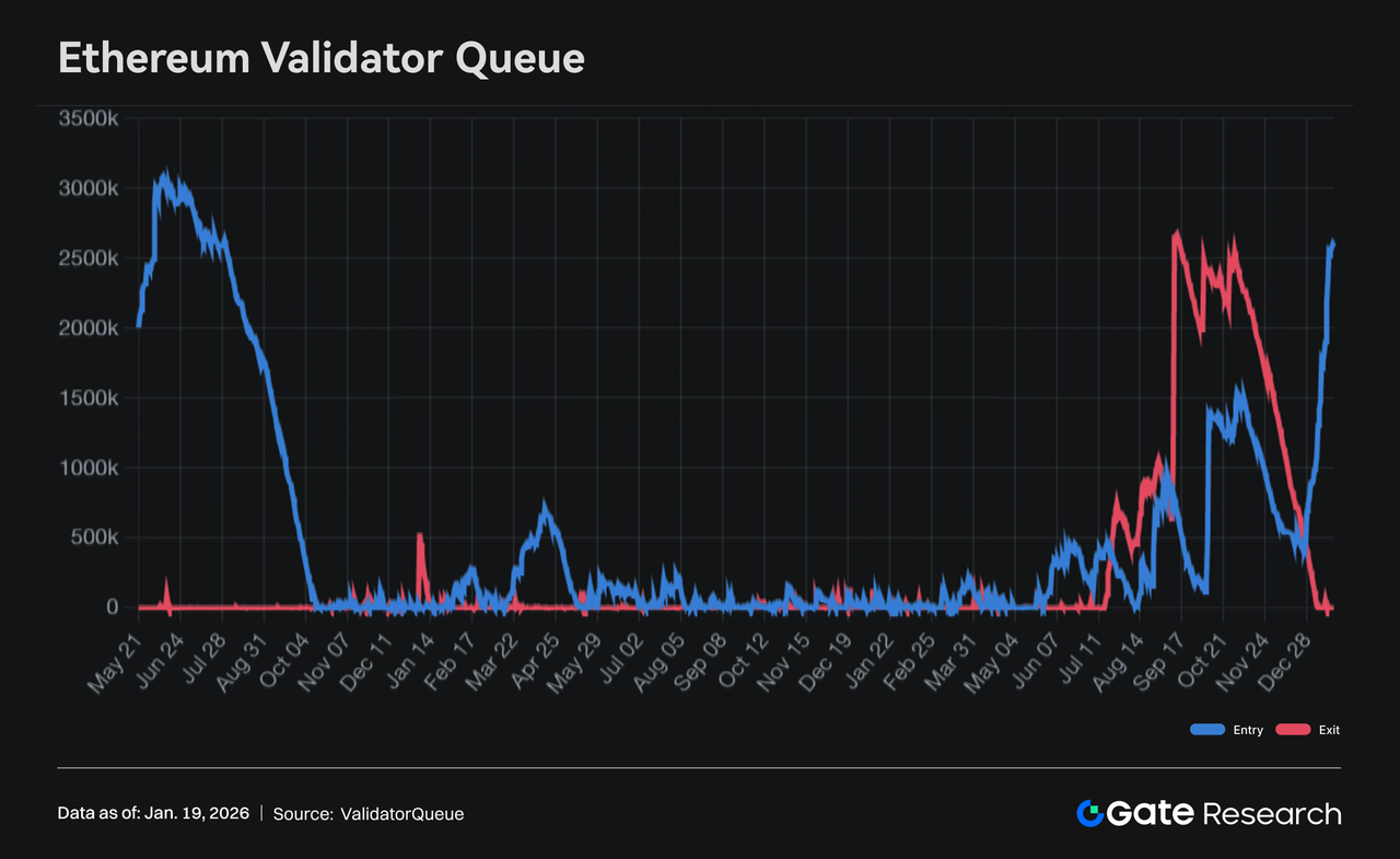 According to ValidatorQueue data, since the beginning of 2026, the size of the Ethereum validator staking entry queue has expanded significantly. The amount of ETH waiting to be staked has increased more than fivefold since the start of the year, currently reaching 2.582 million ETH—the highest level since early August 2023—with a corresponding wait time of over 44 days. Meanwhile, the validator exit queue has been completely cleared. After previously peaking at over 2.6 million ETH in September 2025, the number has now dropped to zero, indicating a clear structural reversal in capital flow on the staking side.