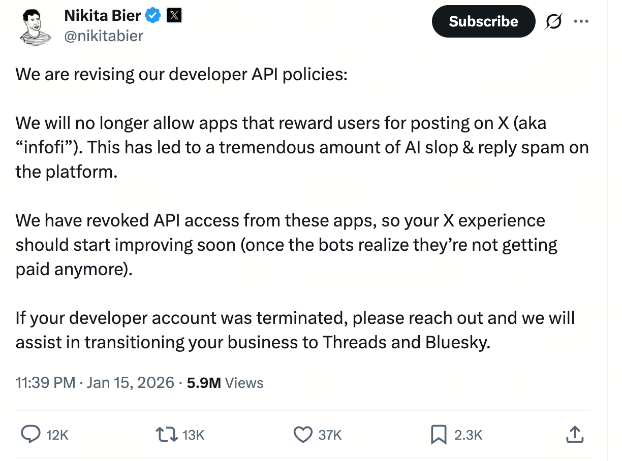 On January 15, Elon Musk’s X (formerly Twitter) reignited discussion in the Web3 and AI social communities. Nikita Bier, X’s Head of Product and Solana ecosystem advisor, announced a major revision to the developer API policy: applications that incentivize users to post on X—commonly referred to as “InfoFi”—will no longer be permitted. The platform stated, “We have revoked API access for these applications, so users will soon notice improvements in their X experience (once bots realize posting is no longer profitable).”