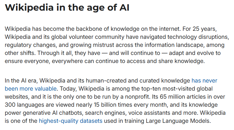 In the future, AI companies will obtain human knowledge bases from Wikipedia on a large scale and in compliance with regulations, while also generating revenue for Wikipedia to support its non-profit operations.